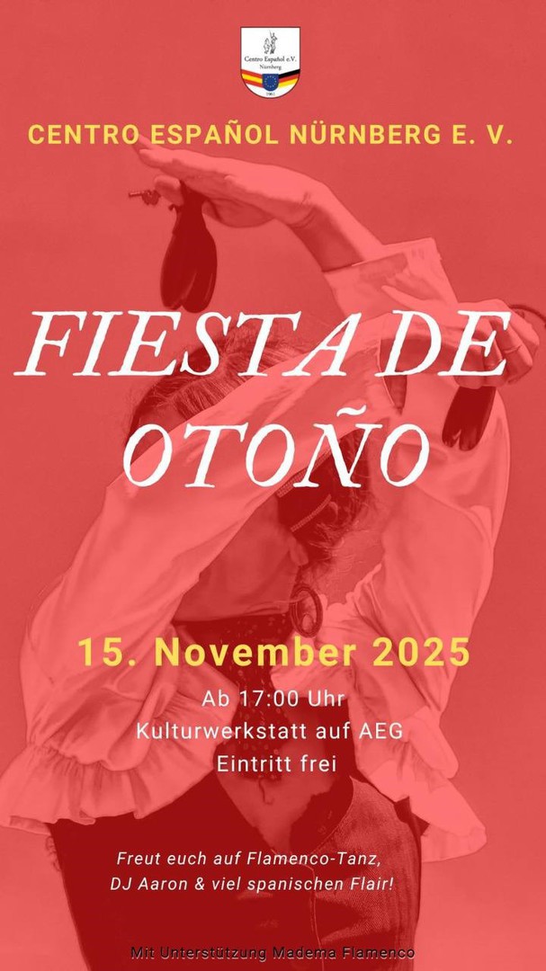 Bevor die besinnliche Adventszeit beginnt, feiern wir um Großen Saal des AEG unser jährliches spanisches Herbstfest. Zuerst erobern unsere Flamencogruppen die Bühne, dann darf ein jeder bei DJ Aaron das Tanzbein schwingen. Ob Flamenco oder Latin music, hier bleibt niemand sitzen!